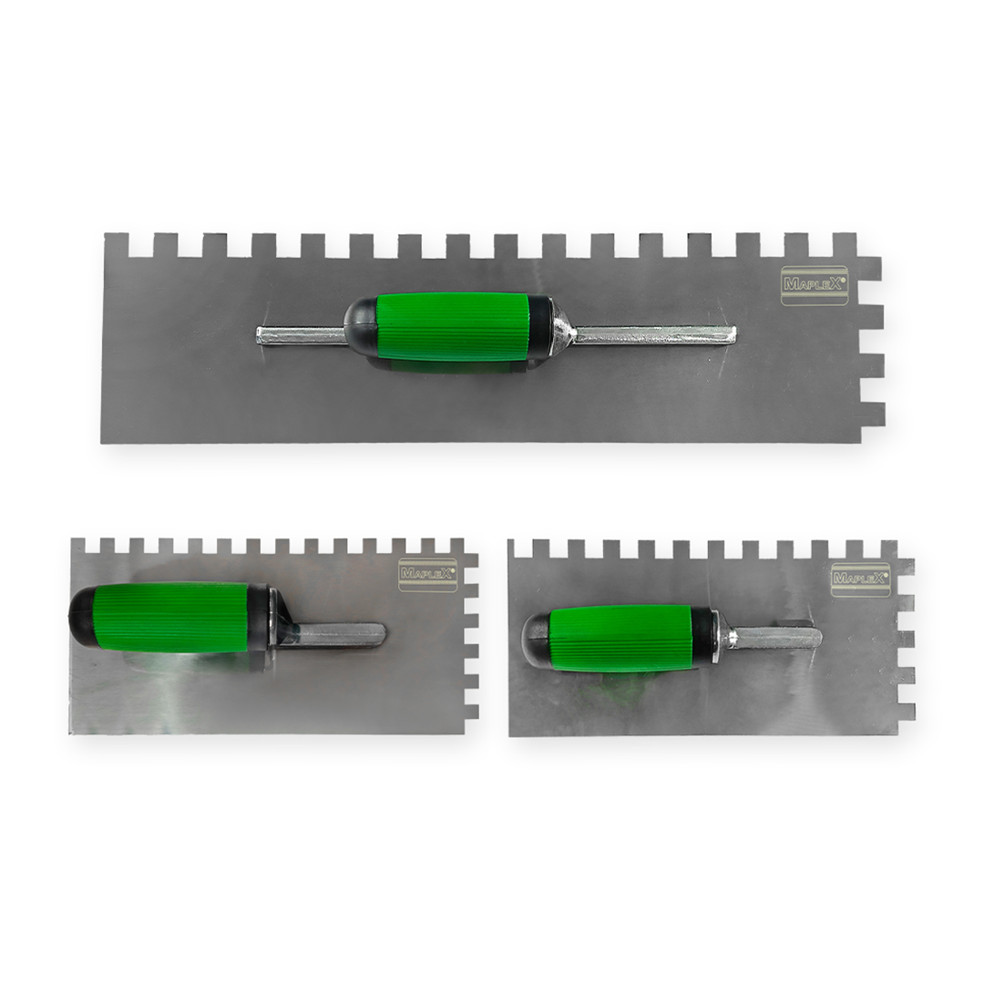 Está diseñada para extender de manera uniforme y adecuadamente el Mortero Adhesivo (PEGO) en las superficies o sustratos donde se Instalarán los materiales de Revestimiento deseados. Sus dientes crean surcos necesarios para la distribución ideal del adhesivo y existe una dimensión de diente según el Formato de Baldosas, otorgando la correcta Adherencia entre las partes y evita problemas futuros.